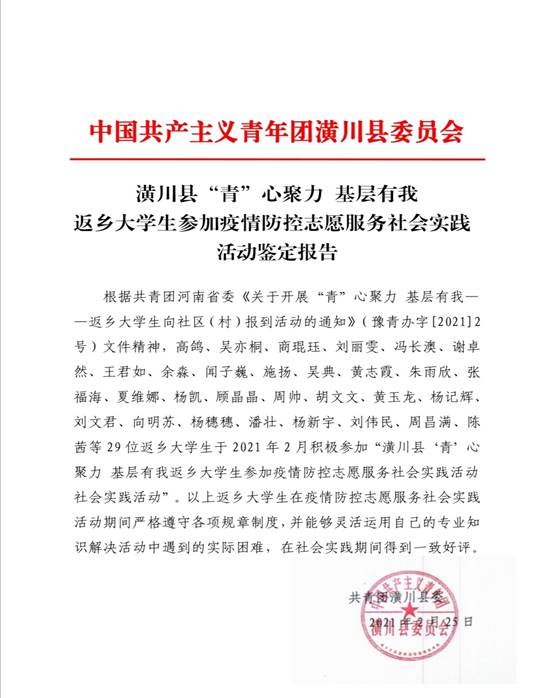 闻子巍,共青团员,河南省信阳市潢川县人,就读于信阳师范公司15vip太阳集团2019级生物技术二班,2020年末参加了潢川团县委组织开展“潢川县共青团‘青’心聚力 基层有我青年志愿服务活动”,和‘青’心聚力 基层有我——潢川县返乡老员工代表座谈会”。
